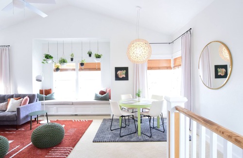 The living + dining space is vibrant and full of natural light thanks to the big windows and vaulted ceilings. Lots of sunshine and real plants make the place happy and fun. Large comfy couch, cozy blankets, and a big sitting window where you can read a good book and chill. You have a 50-inch TCL Roku 4K smart TV and high-speed mesh internet for a comedy night.