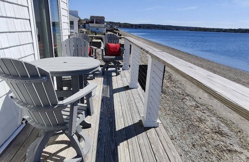 Beachfront Cottage in Island Park, Portsmouth, RI. Enjoy direct access to the beach. Unobstructed waterfront views. Enjoy the colorful morning sunrises and the glowing sunsets from this one of a kind cottage property. Whether inside or outside, this cottage is the ultimate for a relaxing getaway. You will enjoy a clear view from the 3 gliding patio doors that lead you directly onto the wrap around deck. Here you will enjoy comfortable outdoor seating for dining and pleasure. Every room in this cottage has a water view. This property sleeps a maximum of 5. Bedroom 1 has a queen bed. Bedroom 2 has a full bed. A queen size pull out sofa is located in the cozy living room.