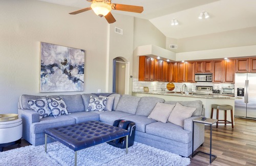 Inside, a plush sectional and smart TV welcome casual downtime in the living room. After walking 18 holes of golf, give your calves a revitalizing workout with the electric leg massager so you're ready for the next day's round. Along with gorgeous countertops and a dedicated wine fridge, the deluxe stainless steel kitchen features all the major appliances, cookware, and utensils needed for family-style meal prep and happy hour hosting convenience. Pre or post-meal drinks and conversation can be enjoyed in the front sitting area.