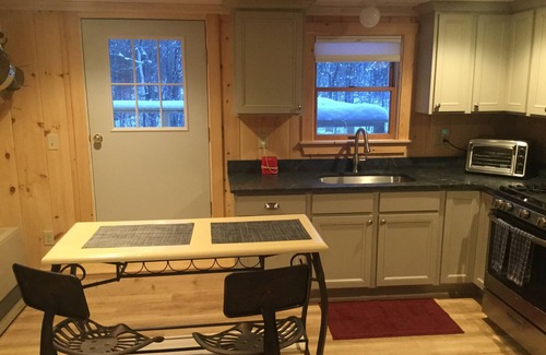 Escape to The Newry Nest, a newly-constructed, 1 bedroom condo located in rustic Newry, Maine. Surrounded by mountainous woodland, this darling condo has everything you need to make your stay a delightful one. The living room has a leather couch and chair to relax on while you luxuriate by the electric fireplace which is sure to add to your ambience and comfort. There is a 50” TV, and games and jigsaw puzzles to help you pass the time in the evenings. Your modern kitchen is replete with a gas stove, pots, pans, steamer, coffee pot, toaster, basic spices, dishes and silverware. There is a private east-facing deck where you can greet the sun and start your day. Enjoy your morning coffee, which is provided by your host, Kevin. End your day with a hot cup of cocoa or a beverage of your choice. Watch the wood line for deer that just might come for a visit!