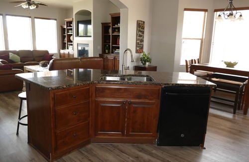 With gorgeous granite counter tops and beautiful cherry cabinets, the kitchen is fully stocked with high quality appliances including refrigerator (2nd refrigerator in laundry room), gas stove, oven, dishwasher and microwave as well as blender, crockpot, griddle, toaster, coffeemaker, etc. to help supplement your cooking experience. Dishes, cups, glasses, wine glasses, and silverware are supplied for 15.