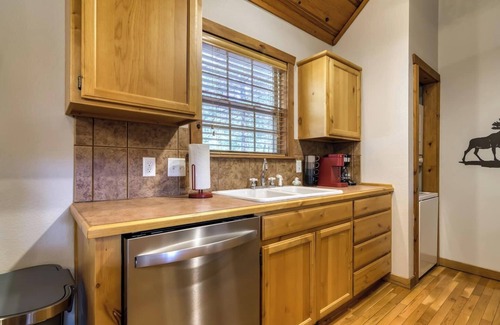 Open the door to this quaint cabin and settle in for a cozy stay. The open floor plan starts with a living room with leather sofa and loveseat to spend cuddling up to a movie and staying warm by the fire. Or have some family fun playing games that are provided.