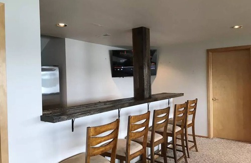 Guests will love the views! Enjoy your morning coffee on the covered deck or have a drink on the covered patio, steps away from the second kitchen bar. There are two large family rooms, a dining room, kids hang out with twin beds and a beautiful open loft. Pets are welcome with pet fee ($200 for up to two pets). Two kayaks, life jackets, pedal boat and a standing paddle board are all included. Flat yard, great for lawn games. Propane BBQ and gas fire tables included for guests to enjoy. These are great to sit around and hang out together, or roast up some marshmallows! Feel free to message us any questions. Thank you for considering our lake home for your next vacation!