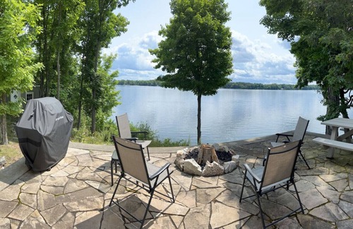 PATIO: Enjoy panoramic lake views and al fresco dining on a huge flagstone patio with built-in campfire pit