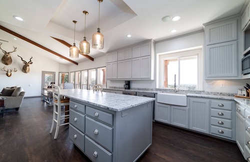 The lodge's pristine kitchen is equipped with ample seating for a large group, double oven, full size refrigerator, microwave, cooktop, coffee pot, utensils, plates, various glass and cookware.