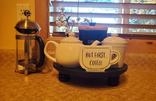 A Keurig coffee maker is provided with a wide selection of coffee and hot cocoa pods, along with a French press for a richer brew. You’ll also find a teapot with a variety of tea bags, raw sugar packets, and coffee creamer for the perfect cup.