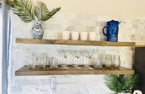 In the kitchen, we have installed all new appliances, cabinets, countertops, and a complete new modern layout. A huge island has been added (10ft x 3.5ft) with 5 barstools for additional seating with a beautiful custom “Exuma Blues” with white marble countertop. All new pots and pans, glassware, silverware, serving platters, kitchen utensils, towels, etc. A new Coffee Bar has been added with a Keurig Coffee Maker (plenty of Coffee Pods provided or bring your own) Everything is NEW in this room and every other room in the house.