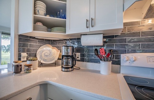 -Kitchen: Fully stocked. Electric range and stove, dishwasher, refrigerator with ice maker and filtered water. Cookware, utensils, glass and dishware for 8 people. Microwave, blender, toaster, drip coffee maker (cone shaped filters). Starter supply of coffee, sweetener, hand and dish soap, dishwasher detergent, and trash bags. Seasonings and spices, olive oil, foil and storage bags.