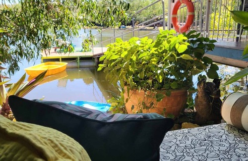Our undercover outdoor BBQ area comes with a hammock and daybed and comfortable seating. Cook up on the fully equipped BBQ and wok burner. Lots of bench space and BBQ tools to make cooking fun and social. Right on the water's edge with steps directly into the water for a second entry point and easy access into the water.