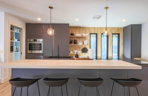 - Fully-equipped, high end kitchen with top of the line appliances, custom cabinetry, floating shelves and a central island.