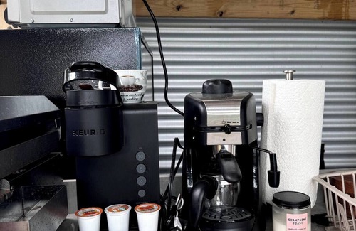 • A compact indoor kitchenette with fridge, microwave, and coffee maker