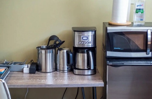 There is a kitchenette only, no full kitchen. Amenities include a mini-fridge w/freezer, microwave, coffee maker, electric kettle, dish tray, plates, bowls, silverware, cooking utensils, cookware, and a two-burner hot plate.