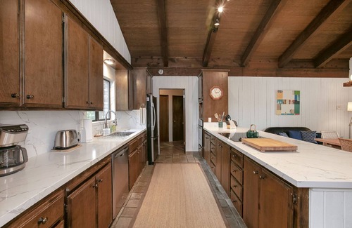 This three-bedroom, three-bathroom home sleeps up to eight and blends laid-back 1970s charm with modern comfort. Vaulted ceilings, a sun-drenched living room, and an expansive deck overlooking the pool create the perfect indoor-outdoor flow. The open layout gives everyone space to connect and spread out, whether you’re sharing a meal, playing games, or disappearing into a book.