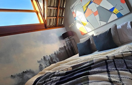 Ruled by the power of crystals and amethysts, the room draws a modern and ancestral decoration, a place conducive to connection and relaxation. Spacious atmosphere, with a nice mural, sculptures and exhibition of paintings, will make the accommodation a delicious experience