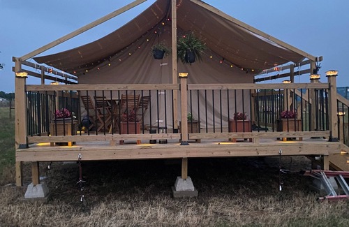 Private safari tent with ac/heat, Wifi and an exceptional view off a large deck. | RV Rental in Lone Oak