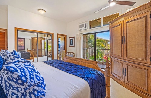 Our in-house professional design team has collaborated with our owner client to create a comfortable, clean, and refreshed interior. Envision Modern Tommy Bahana island-style elegance & comfort with a modern fusion of color and balance that harmonizes and brings joy. Open concept living with a brand new pull-out queen sleeper sofa in the living room with direct access to its own bathroom making sleeping for 4 very comfortable. This unit exudes all the comforts of home yet located in Paradise- Maui! The spacious primary residence features a new King Bed, clean and soft 550 Pima cotton linens, and ample clothing storage. Directly adjoining is the the ensuite bathroom and outdoor balcony looking towards Molokai island and the ocean view.
