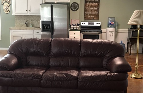 PRIVATE-SECLUDED getaway. WIFI Hot Spot - 1200 sq. ft. home for the outdoor lover on 10 acres. The one acre pond for fishing and swimming. Shooting range, bar-b-que pits for outdoor cooking. Complete kitchen with side by side refrigerator/freezer, coffee pot, toaster, dishes, pots and skillets. Large dining table with 6 chairs. Very secluded. You will see cows, donkeys, horses, maybe a few deer and a few cars at a distance. Fishing pier. The house is approximately 30X40 with french doors going to the patio and the pond. Large picture windows for great outside viewing. French doors going to the spacious bedroom with queen size bed and an attached bath for your privacy. Drinking water dispenser, coffee, creamer. Bring your fishing poles/bait, shooting gear & food. (Please pick up your brass) Queen bed, private bedroom, two couches and a recliner.