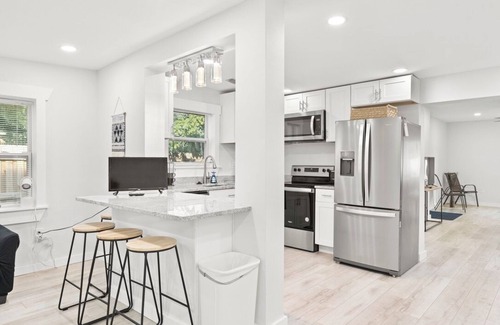 Fully appointed modern kitchen with appliances, including stove, oven, refrigerator, dishwasher, and microwave. Bedrooms are comfortably furnished with fresh crisp new linens, pillows, and bed coverings. Master bedroom features a private en suite bathroom and Smart TV.