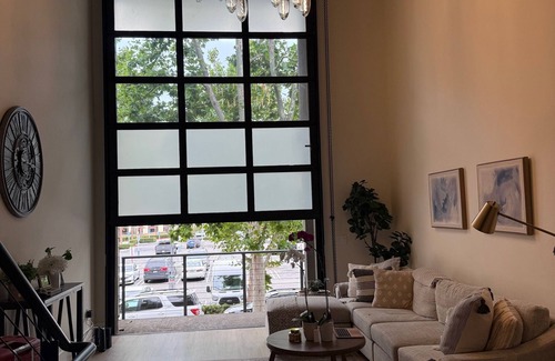 Stay in a stylish 3‑story loft with 35‑ft ceilings, a roll‑up glass garage door, and a prime walkable location near shopping, dining & top hospitals.
