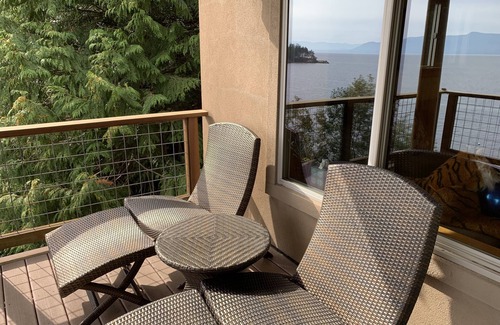 Enjoy our beautiful Mt Baker view waterfront home with spacious living and dining areas, fully equipped kitchen, 2 separate workspaces with desks and fast wifi, 2 King bedrooms and 2 full bathrooms, and queen bed in loft space. Dip in our top deck sea-view hot tub, enjoy our sea facing fire pit and bbq. Tranquil setting for relaxing on this magical island 5 minutes off the mainland. Enjoy access to a freshwater swimming lake, playground, volleyball court, basketball hoop, picnic cabana and private community beach with a dock and boat launch.