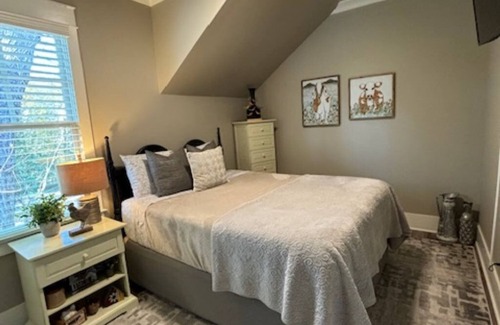 The beautifully furnished, squeaky clean carriage house, has two cozy bedrooms with super comfortable mattresses and only the best linens and bedding. You will also find a full bathroom and kitchenette - all with high end finishes. Great amenities include a coffee maker, fully stocked kitchen, washer and dryer, a desk for working, and of course, snacks and bottled water! Your stay includes private parking on the property for multiple cars. Our property is just a few miles from Georgia 400 and wherever you would like to go in the area.