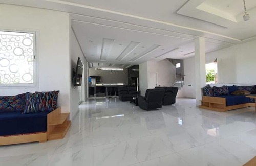 The villa features 4 bedrooms, 3 bathrooms, 3 Living rooms (2 Moroccan living rooms, 1 modern living room), a fully equipped kitchen with a microwave and a fridge and a washing machine and a couple of a flat-screen TV's with satellite channels.
