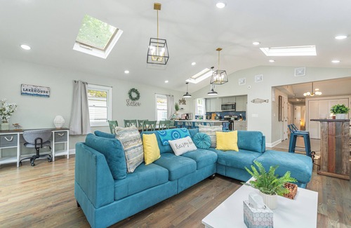 Comfy house to accommodate large groups for a time away from it all. Open spacious living room with private bar, office station and large kitchen. Great for entertaining. Wake up to beautiful views of the lake.