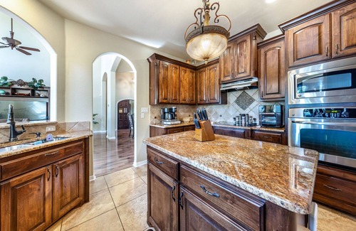 - High-End Finishes: The two-story custom home boasts high-end finishes, including travertine floors, granite countertops, antique wooden doors, Knotty Alderwood cabinets, and Texas sandstone accents in the kitchen and living room.