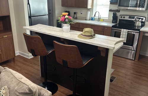There are two bed rooms, one has a king size bed and the other has a queen size bed. The Glass room has two queen beds. There are two bathrooms, both with bathtub shower combinations. Kitchen is equipped with regular size oven, Microwave, toaster and coffee maker. Linen and dishes provided.