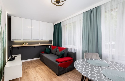 Prokocim Modern Studio is a stylishly furnished apartment that features a living room with a sofa bed and a kitchenette, as well as a bathroom. Guests have access to a range of practical amenities, including free Wi-Fi, cable TV, washing machine, iron, hairdryer, microwave, toaster, refrigerator with freezer, and kitchen accessories.