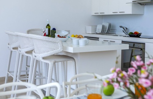 This modern and luxurious villa, furnished with almost care to feel like a home away from home, offers panoramic seafront views, a private pool, a patio with modern patio furniture, large roof top terrace and BBQ.