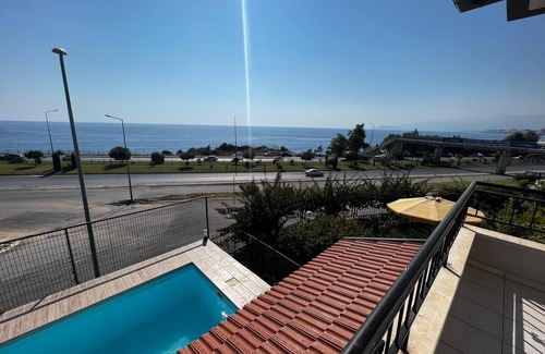 Our villawith private pool by sea side and full sea view 100 metre to shops 3 room 1 liveng room 7-8 personcan easly stay.there sops near by villaand only 10 minute from centrum with bus.wifi is yes..