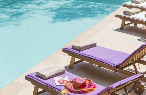 Designer’s terrace with 10 sun loungers next to pool and 3 large tents.