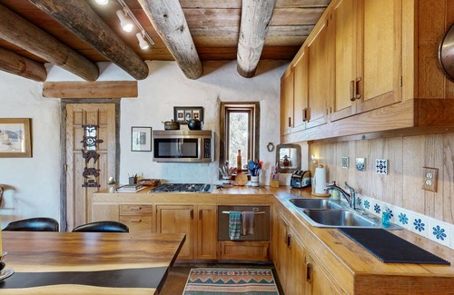 Nestled at the base of the Ortiz Mountains, this rustic Pueblo-style 2BR, affectionately known as Casa de las Piedras, is one of a kind. The Southwestern abode is decorated with regional artwork, pottery, and folk art. Enjoy plenty of outdoor space to unwind and take in the surroundings. Kick back on the stone terrace and bask in gorgeous sunsets and mountain views, or enjoy an al fresco lunch in the gazebo.