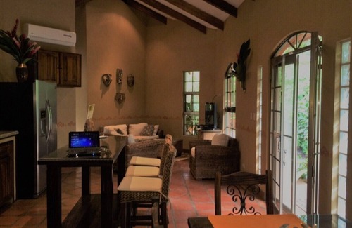 Located in Costa Rica’s Central Pacific area and only minutes away from Carara National Park and the Tarcolces Crocodile Bridge. The home is carefully placed, with our guests privacy in mind, on a fully enclosed fruit grove consisting of mango, star fruit, guava, guanabana, papaya, cashew, avocado, bananas, plantains, lemon, orange, and grapefruit trees. There are many restaurants, souvenir stands, markets and local fruit stands within walking distance. Complete tourism destination planning, payment, and transportation arrangements for individuals or groups can be arranged through our virtual concierge, who is fluent in English and Spanish. Some of the amazing wildlife that ventures on and off the property including a large troop of Mantled Howler Monkeys, butterflies, turtles, red tailed squirrels, iguanas, Coati, frogs, fruit bats, forest rabbits, Agoati, Scarlet Macaws as well as a variety of other seasonal tropical birds.