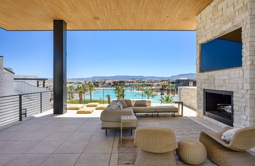 Step outside to the private backyard, where you'll find a beautiful grassy area, an outdoor dining table, a grill, a private pool, a hot tub, and a gate with direct access to the community lagoon and beaches. For even more outdoor enjoyment, relax on the upper decks with fire tables or watch a movie on the outdoor TV. The basement is an entertainer’s dream, featuring a cozy movie theater, basketball shootout, shuffleboard, and an exercise room perfect for group yoga sessions. At night, enjoy breathtaking, unobstructed views of the beach and lagoon. Pura Vista is one of the most exceptional vacation rentals in Utah—you won't regret booking your St. George vacation here!