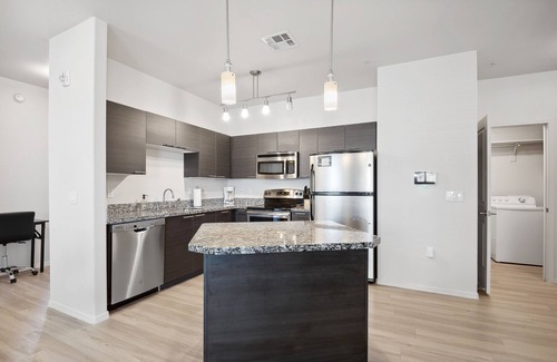 Pure Suites Furnished Housing. Thisapartment includes a chef-inspired kitchen with stainless steel appliances, walk-in closet, in-unit washer and dryer and controlled heating/air. Two bedroom apartment with King Bed in Master, Queen Bed in 2nd Bedroom, and a queen pull-out sofa in the living room for guests.