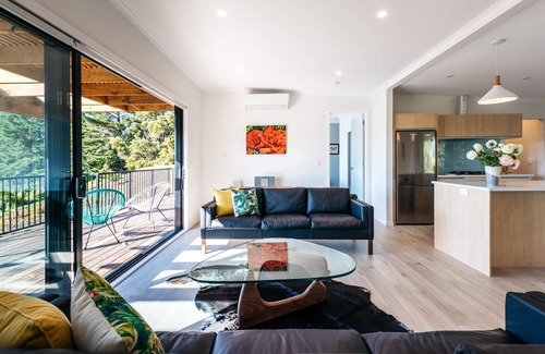 The villas are architect-designed with top-end fixtures and fittings. Relaxed but stylish living is the plan! Entry is into a large open plan kitchen, dining and living room. Separated from this is a second living/media room, with a sofa bed and a TV with Netflix, so there is room for different groups to enjoy their own space. The kitchen is very well equipped with high-end appliances including a Nespresso machine, and has a walk in pantry. Both living areas, as well as the front 2 bedrooms, open onto a spacious deck, with a large outdoor dining table, as well as lovely, comfy outdoor chairs, perfect for relaxing with a glass of superb Waiheke Island wine! The house faces north-east so gets great sun all day long.