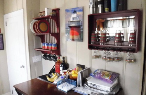 The fireplace in the living room is not recommended for use during the summer months. The mantle of the fire place has a Beach built that you can add any shells or beach glass that you may find on the beach. This provides ambience of this beautiful beach house.