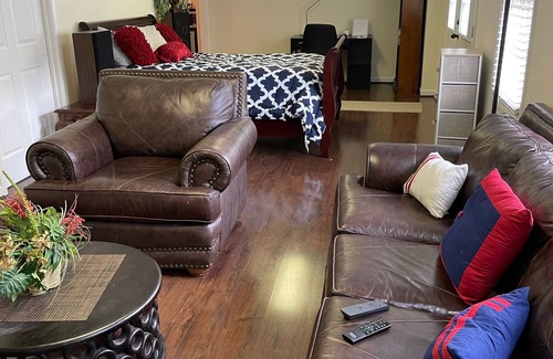 Welcome to your separate entrance, private and secure studio. This studio is on the lower level / basement of a house. Enjoy coffee or a nightcap in your private courtyard. Slumber sweetly in a queen size bed, which sleeps two or rest from a long day of activities in the living room area. Feel just like home in your private bathroom. Amenities include refrigerator, microwave, coffee maker, Wifi, cable, parking at end of owners driveway.