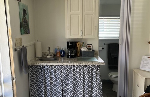 This tiny cabin offers the essentials to enjoy your getaway! A clean space with a queen bed, bathroom with shower, and kitchenette area (including coffee maker, microwave, hot plate, and fridge), and dining table.