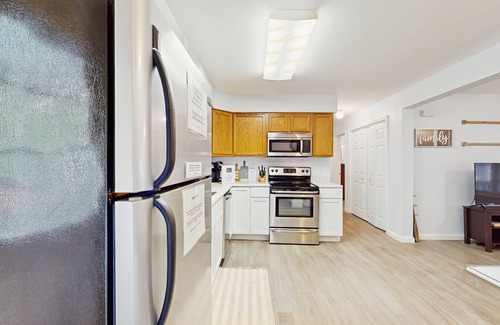 Tucked away in peaceful seclusion and surrounded by lush foliage, this charming retreat offers the perfect escape for those seeking tranquility while staying close to all the action. Start your mornings and end your evenings by the warmth of the wood stove, sipping your favorite beverage as you fully embrace vacation mode. The full kitchen, complete with a cozy breakfast nook, is perfect for whipping up home-cooked meals before heading out for a day of adventure. After a fun-filled day, the inviting living area provides a great spot to unwind, with free WiFi, cable, and four flatscreen TVs offering plenty of entertainment. For a more rustic evening, gather around the firepit under a starlit sky.