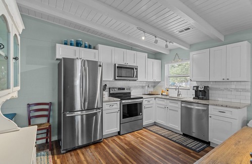 Side A of All My Chillin has two bedrooms, one king and one queen. Open concept living area with large dining table great for puzzles and games. Screened in Porch and a large outdoor patio area as well as a fenced in yard and outdoor shower with hot water.