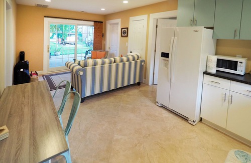 Inside the house there is an open living-kitchen area with one bedroom and a full bathroom. There are no stairs to navigate on this property, and beautiful tile floors make for easy transitions.
