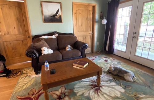 This sweet little place is tucked away in a ghost town, Central to several places of interest, making it easy to plan your visit. Within 20 minutes of Atoka, home of Reba‘s place, 45 minutes of Durant and Choctaw Casino – and Tishomingo, home of Ol’ Reds and Blue River. Its’s Handicap assessable. This little house was built for my Vietnam veteran uncle. He was handicapped and enjoyed his independence. He helped to design the B1 stealth and this home has been decorated in his honor. We lovingly referred to him as Beano. We welcome you to Beano’s Pad and hope you enjoy some history. Note, he did not pass away in his home. His two little dogs have moved across the yard to my home, but they can sometimes be found inside Beano’s Pad if the door is left open.