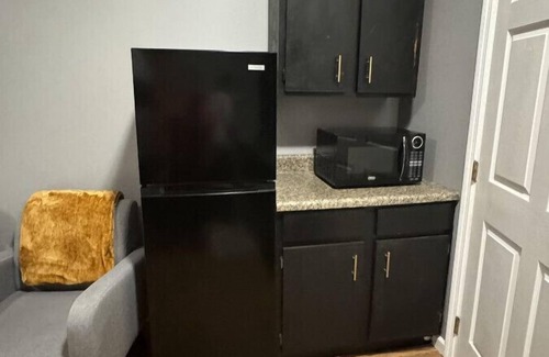 This space is equipped with everything you could need in a home away from home. Need a good night's rest? We have a comfy, full-sized bed perfect for two. Have more than two? We also have a small loveseat couch that folds out to make a small pallet bed. This would be perfect for your accompanying little one. There is a dinette in the studio, fully equipped with any cooking utensil you could need, a mini-fridge, a toaster oven, a full coffee bar, and a sink. Once you make a delicious meal, you can sit down to eat at our two-person dining room table. Here for work? The dining room table perfectly doubles as a dedicated workspace. There is also a full attached bathroom with a shower/tub combo, toilet, and vanity. We also provide bathroom linens for your stay. Come stay with us in this quaint studio apartment!.