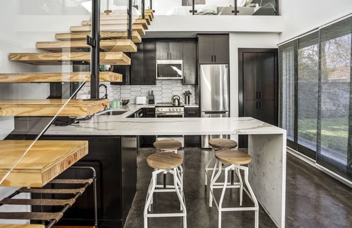 Welcome to the Quantum Tiny Loft located in the revitalizing East End of Houston. The dictionary definition of quantum is a discrete quantity of energy proportional in magnitude to the frequency of the radiation it represents. The discrete energy of this space will awaken your imagination to limitless possibilities. This unique, not so tiny loft is 400 square feet in size. This smart dwelling has 20 foot tall ceilings, panoramic windows for tons of natural light, a lofted bed for maximal space efficiency, a fully stocked kitchen for cooking, custom appliances, super-fast wifi, smart TV, a giant california king bed, a full size convertible sofa bed and all the amenities a guest needs for a one of a kind visit. The detail oriented quantum design, industrial finishes and simplicity of the black and white color scheme mixed with pops of blue will bring your vibration to the optimal frequency. This loft is truly an experience of excellence in habitation. This space is perfect for couples, small groups of friends, co-working groups, solo travelers or anyone with discerning taste who is looking for something private and unique.