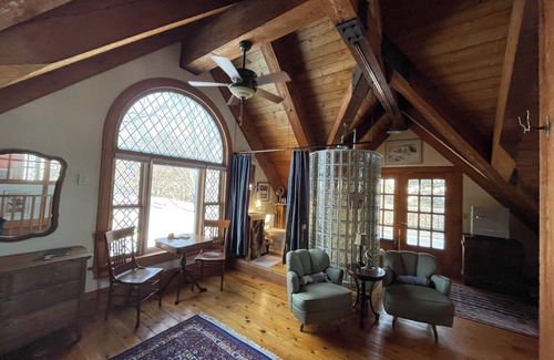Betty's Room features exposed beams and a new stand alone paisley glass block shower! It's a work of art!!