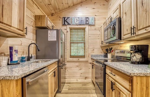Escape to "Queens Quarters" and unwind in our cozy one-level duplex cabin that sleeps four. This charming retreat sits beside the tranquil Greenbriar Creek and offers a fully equipped kitchen with stainless steel appliances, an open living and dining area, a spacious bedroom with a flat-screen TV, and a luxurious ensuite