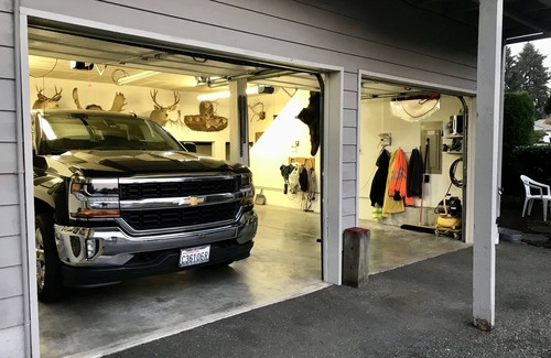 1500 sq ft 2 BR/2 BA duplex. Fully equipped Kitchen. Spacious living room. work area, & dining room.Two 70”screen TVs one 40”TV. Cable, fast WiFi. Queen beds in each BR, en-suite BA in master. 2nd BA in hall. Full size WA/Dry in laundry room. Dble Garage plus xtra parking. Close to shopping, restaurants, and quick freeway access to hospitals, JBLM, boating, and hiking. Nestled at the end of quiet a cul-de-sac. Surrounded by trees has a lg lower patio with bar-b-que, gardens and a fire pit area.